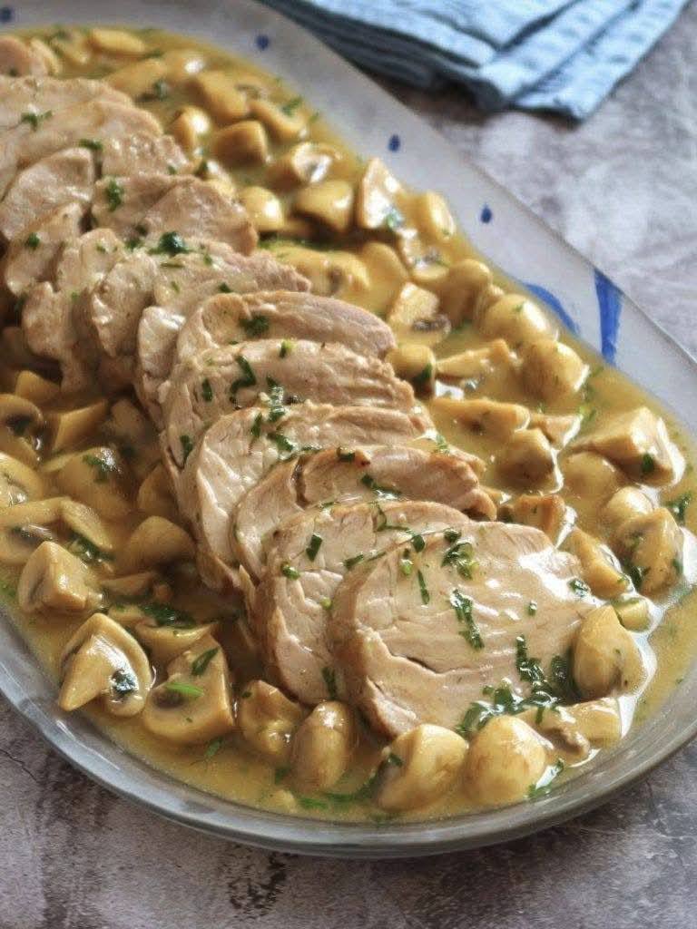 Affettare l'arrosto sottilmente e irrorarlo generosamente con la salsa ai funghi.