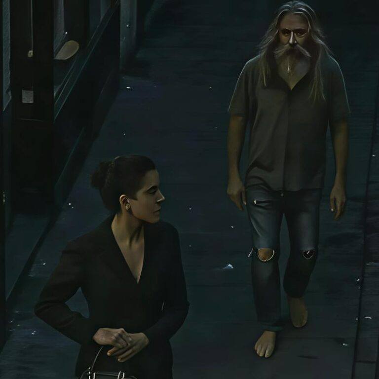 Era un uomo sulla cinquantina, forse più anziano. Camminava a piedi nudi sull'asfalto freddo, come se non sentisse il dolore. Aveva una lunga barba grigia e incolta, e i capelli gli ricadevano sulle spalle in ciocche sporche. I suoi vestiti erano strappati, logori e macchiati di polvere e del tempo.