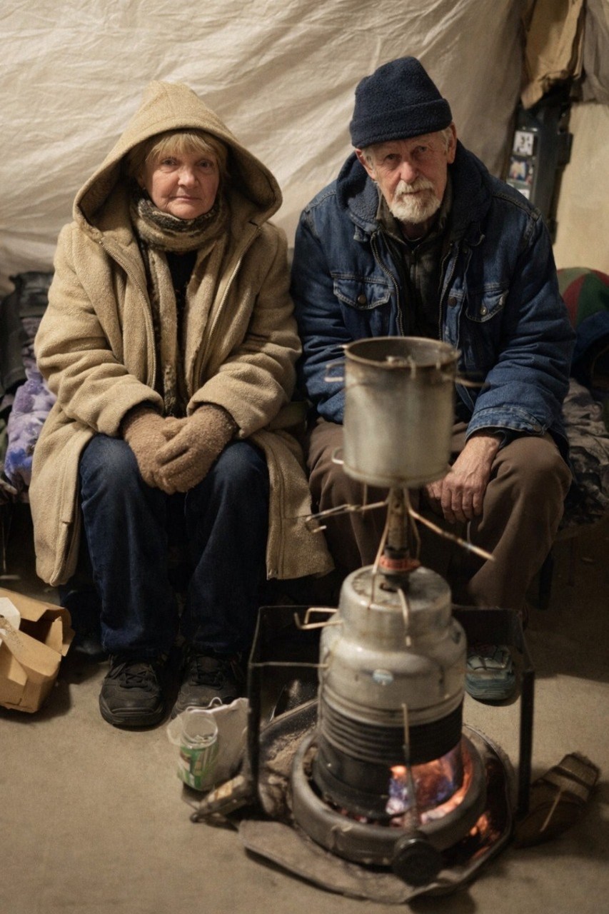 Mio padre era seduto su uno sgabello, intento a riparare una vecchia cerniera di un mobile. Mia madre era seduta su una sedia pieghevole, con indosso il cappotto invernale. In un angolo c'era un lettino da campeggio. Un piccolo fornello da campeggio. Un tavolo, due sedie. Tutto qui.