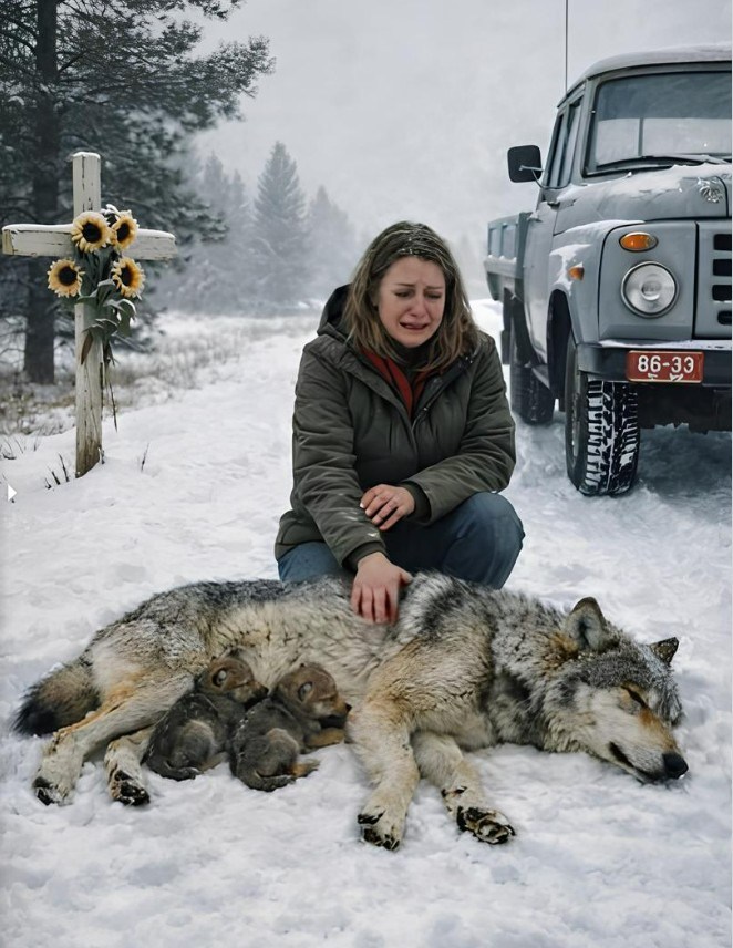 La donna fermò l'auto e scese. Avvicinandosi, si rese conto con orrore che un lupo giaceva davanti a lei. L'animale era congelato ed esausto, e due piccoli cuccioli di lupo erano raggomitolati accanto a lei. I cuccioli piagnucolavano e tremavano per il freddo e la paura, come se implorassero la madre di alzarsi.