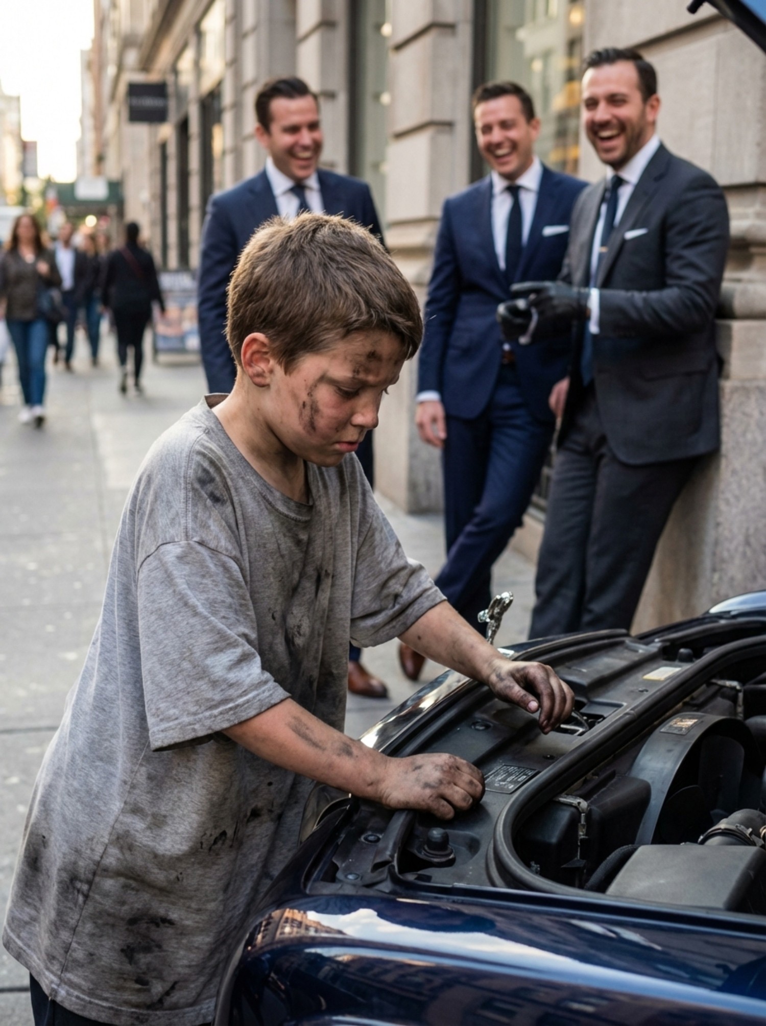 L'espressione calma sul viso stanco del bambino contrastava con l'arroganza degli uomini. "Se non vi dispiace, posso aiutarvi", disse, suscitando una risata tra gli uomini elegantemente vestiti. Uno di loro sogghignò: "Guarda, ecco il nostro salvatore! Riuscirai a far ripartire questo motore?". Il milionario si limitò a scrollare le spalle e, come se stesse assistendo a una commedia, lasciò che il bambino si avvicinasse. Nessuno dava la minima possibilità che quelle piccole mani potessero riparare qualcosa.